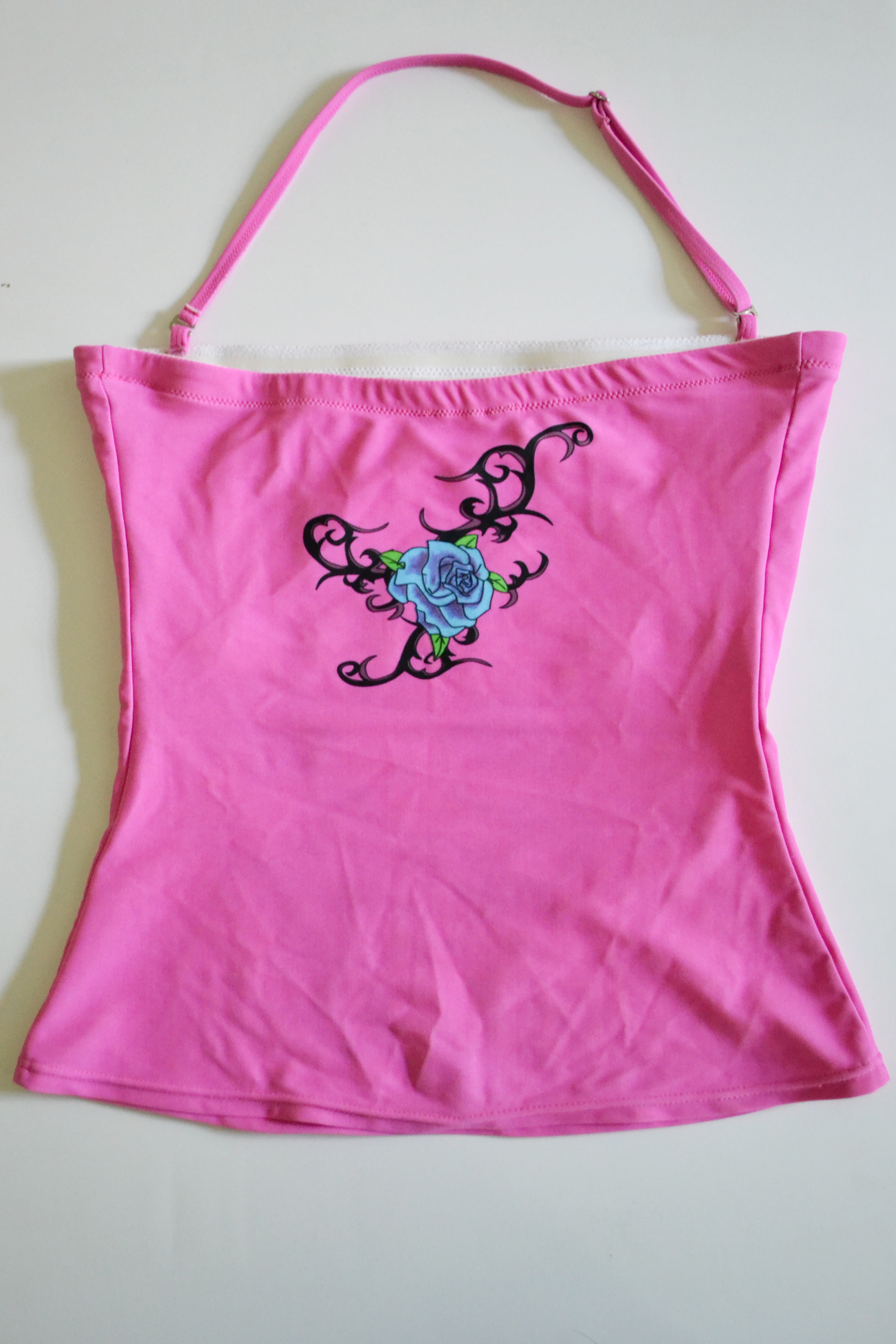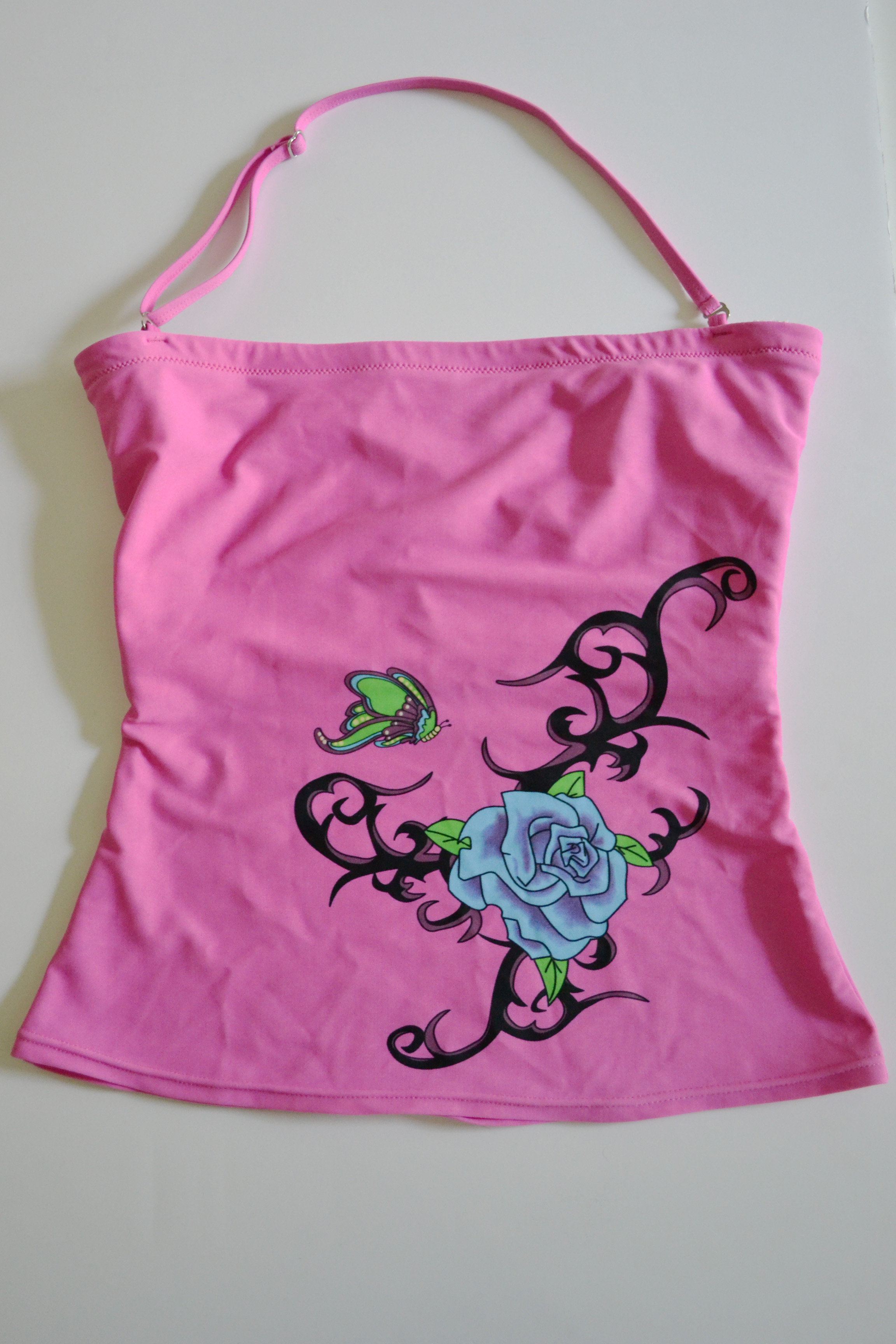 Unreal pink halter/tube top (removable neck strap) with tribal, roses and butterfly print.